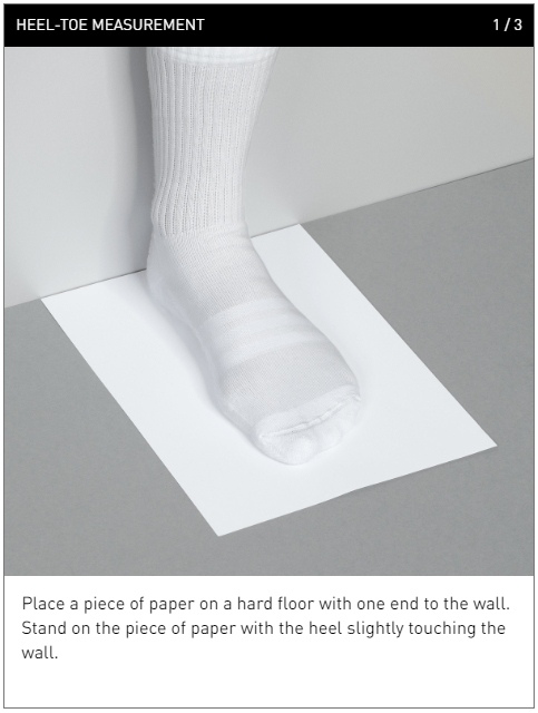 1. 단단한 바닥에 종이를 벽에 닿게 놓고, 발뒤꿈치가 벽에 살짝 닿게하여 종이 위에 올라 서세요.