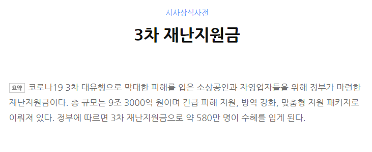 [네이버 지식백과]에서 3차 재난지원금에 대해 찾아보면 아래와 같이 정의되어 있습니다.